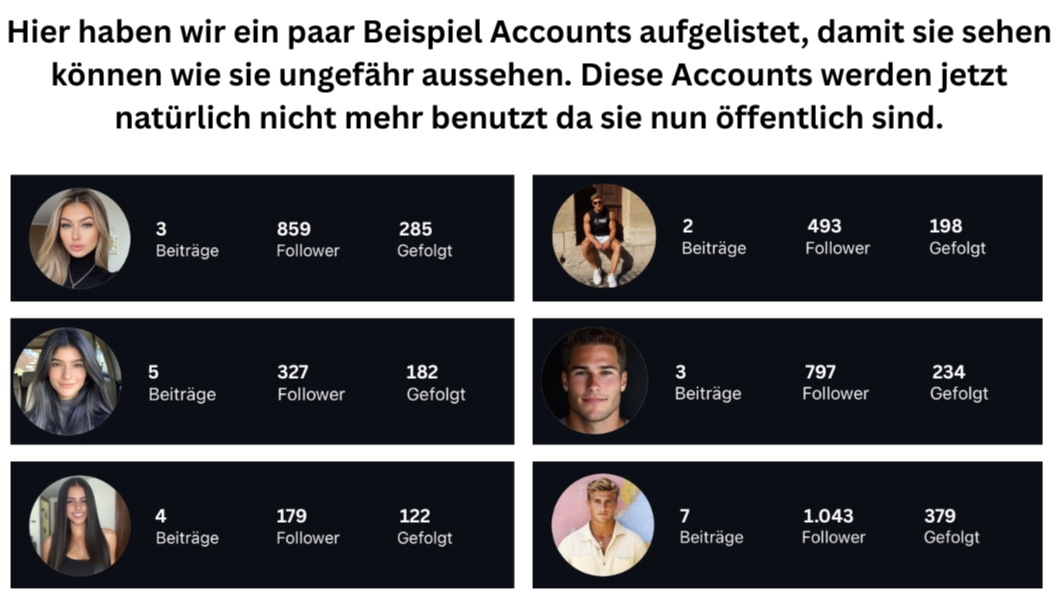 Nachdem du uns den Instagram Namen deines Partners/in mitgeteilt hast und auf was für eine Art von Typ dein Partner/in steht suchen wir einen von über 30 Instagram Acoounts mit echten Followern und Bildern raus der deinen Partner/in am meisten ansprechen wird und testen ob er/sie dir wirklich treu ist....
